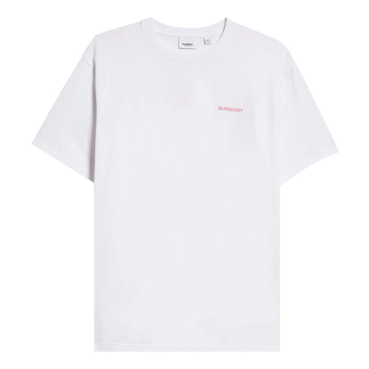 Burberry Branded Back Logo White T-Shirt. Elevate your style with the Burberry White T-Shirt. This iconic White T-Shirt from Burberry is not only fashionable, but it also offers a comfortable fit and premium quality. Perfect for any occasion, this shirt will make you stand out and feel confident.. 100% Cotton, Crew Neck. Made In Portugal. Branded Logo On Left Chest, Branded Back Logo.