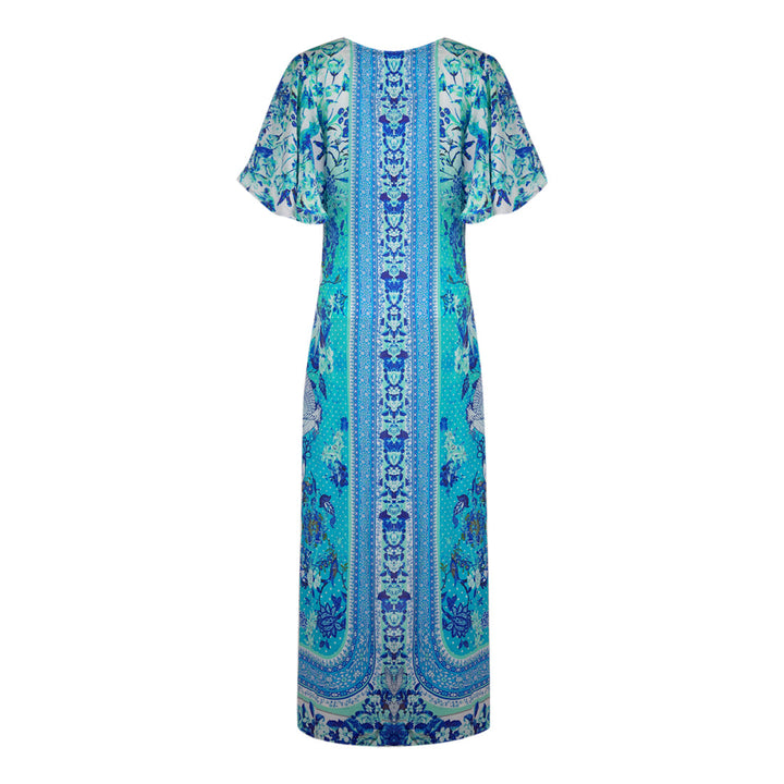 Inoa Catalina Azuro 12002 Blue Silk Maxi Dress. Show off your style wearing the Inoa Blue Dress. Its flattering Print make it a timeless piece for your wardrobe. Crafted from luxurious fabric, you'll make a statement with every wear. Make a statement in style!. 100% Silk, Blue Design. Short Sleeve, Maxi Dress, Button Closure, Removable Waist Tie. This Item is suitable for sizes UK 8- UK 14. Product Style: Catalina Azuro 12002