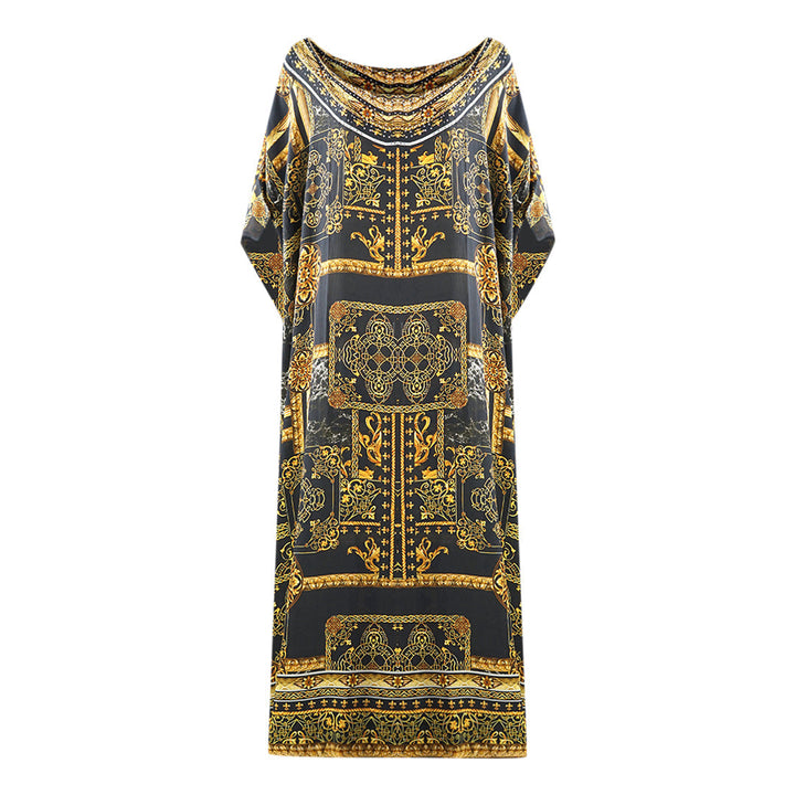 Inoa Verona 1915 Black Box Kaftan Cover Up. Show off your style wearing the Inoa Black Kaftan. Its classic uneven Style and flattering Print make it a timeless piece for your wardrobe. Crafted from luxurious fabric, you'll make a statement with every wear. Make a statement in style!. 100% Silk, Gold Colour Design. Pull over, Beach wear, Chain Pattern. This Item is suitable for sizes UK 8- UK 14. Product Style: Verona 1915