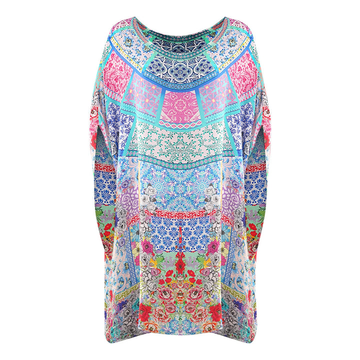 Inoa Martinique 12004 Blue Floral Short Kaftan Cover Up. Show off your style wearing the Inoa Blue Kaftan. Its classic uneven Style and flattering Print make it a timeless piece for your wardrobe. Crafted from luxurious fabric, you'll make a statement with every wear. Make a statement in style!. 100% Silk, Multi Colour Design. Pull over, Beach wear, Pattern. This Item is suitable for sizes UK 8- UK 14. Product Style: Martinique 12004 Short Kaftan