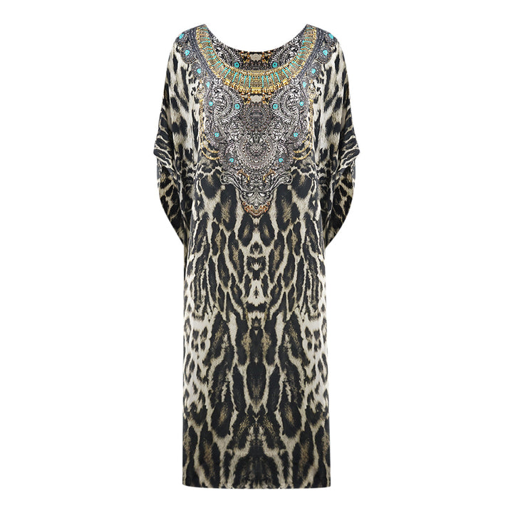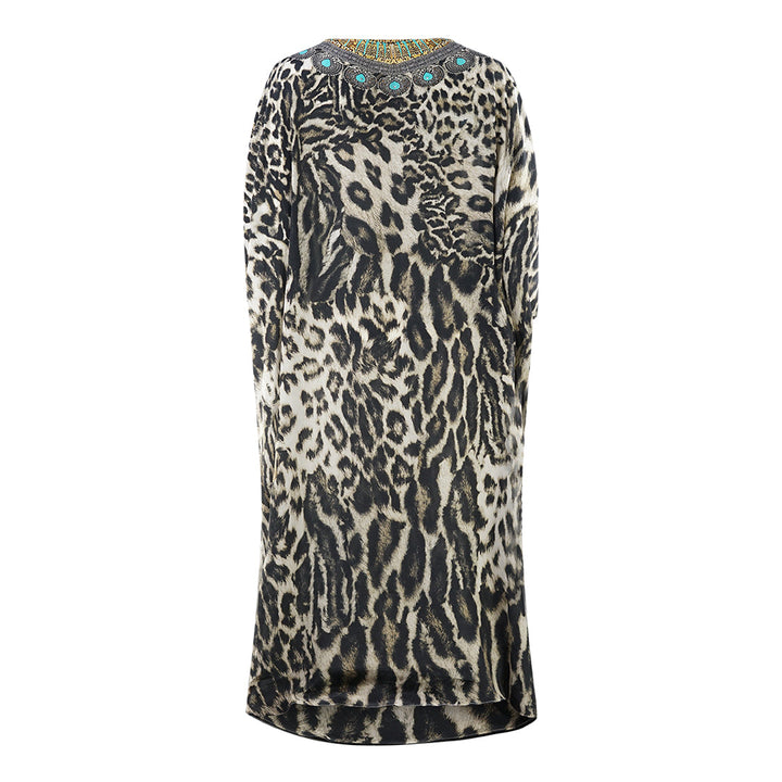 Inoa Siberia 1927 Brown Box Kaftan Cover Up. Show off your style wearing the Inoa Brown Kaftan. Its classic uneven Style and flattering Print make it a timeless piece for your wardrobe. Crafted from luxurious fabric, you'll make a statement with every wear. Make a statement in style!. 100% Silk, Animal Print Design. Pull over, Beach wear, Animal Skin Pattern. This Item is suitable for sizes UK 8- UK 14. Product Style: Siberia 1927